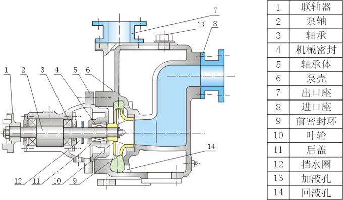 2、检查泵壳内的储液是否高于叶轮的上边缘,如若不足,可以从泵壳上的加液口处直接向泵体内注放储液,不应在储液不足的情况下启动运转,否则不能正常工作,且易损坏机械密封。