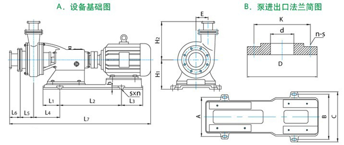 | 泵性能参数序号 | 型号 | 配套电机 | A | B | C | E | H1 | H2 | L1 | L2 | L3 | L4 | L5 | L6 | h | sxn |